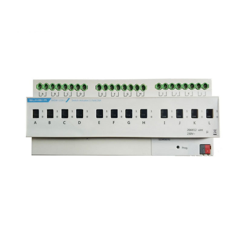 12路20A KNX开关执行器 可手动开关开关及状态反馈上电和掉电操作场景和预值控制逻辑输出强制操作安全功能阈值功能楼梯照明功能延时开关